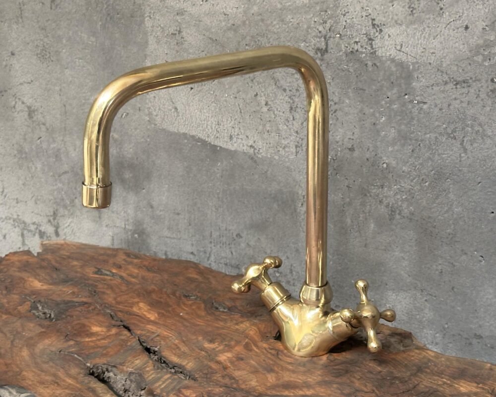 Unlacquered Brass Kitchen Faucet, with Flat cross handles, has a gooseneck shape that extends over your sink for a streamlined