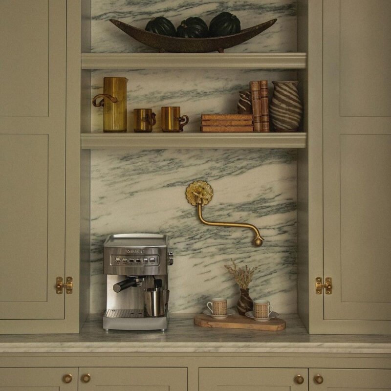 A traditionally designed, highly functional, unlacquered brass pot filler with a downward spout and decorative escutcheon provides a luxurious kitchen