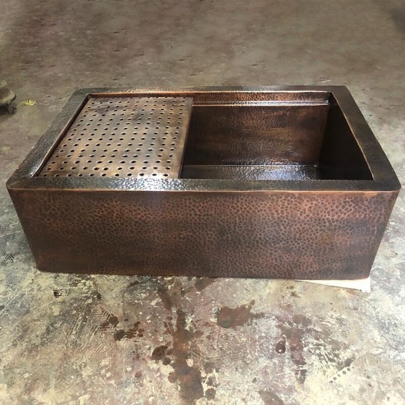 Aged Copper Patina farmhouse sink with flat grid