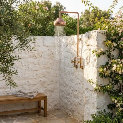 This handcrafted outdoor copper rain shower is a statement piece designed for luxury gardens, patios, pool areas, riads, and spa-style