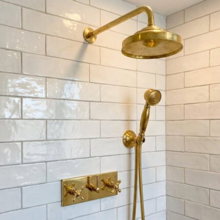 This luxury unlacquered brass exposed shower system is crafted from solid brass and designed to age beautifully with a natural