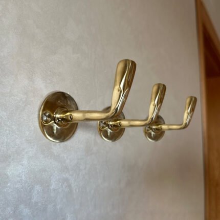 The Set of Unlacquered Brass Wall Hooks is a handcrafted coat hanger and towel hook set that adds a touch
