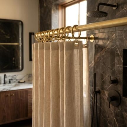 Unlacquered Brass Shower Curtain Rod – Wall Mounted Rail with Rings