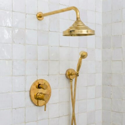 Indulge in multiple showering options with the Handcrafted Solid Brass Shower System, with a curved arm and swivel head shower