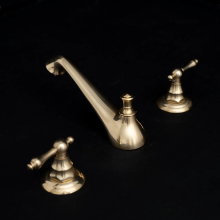 A 3-hole bathroom faucet in unlacquered brass with lever handles features a vintage spout that extends over your sink for