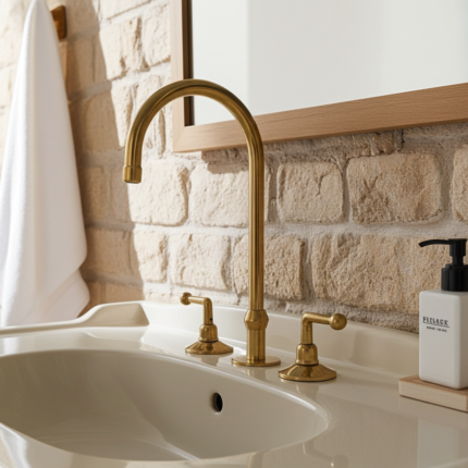 This Unlacquered Brass 4 Holes Bathroom Faucet with sprayer has a gooseneck shape that extends over your sink for a