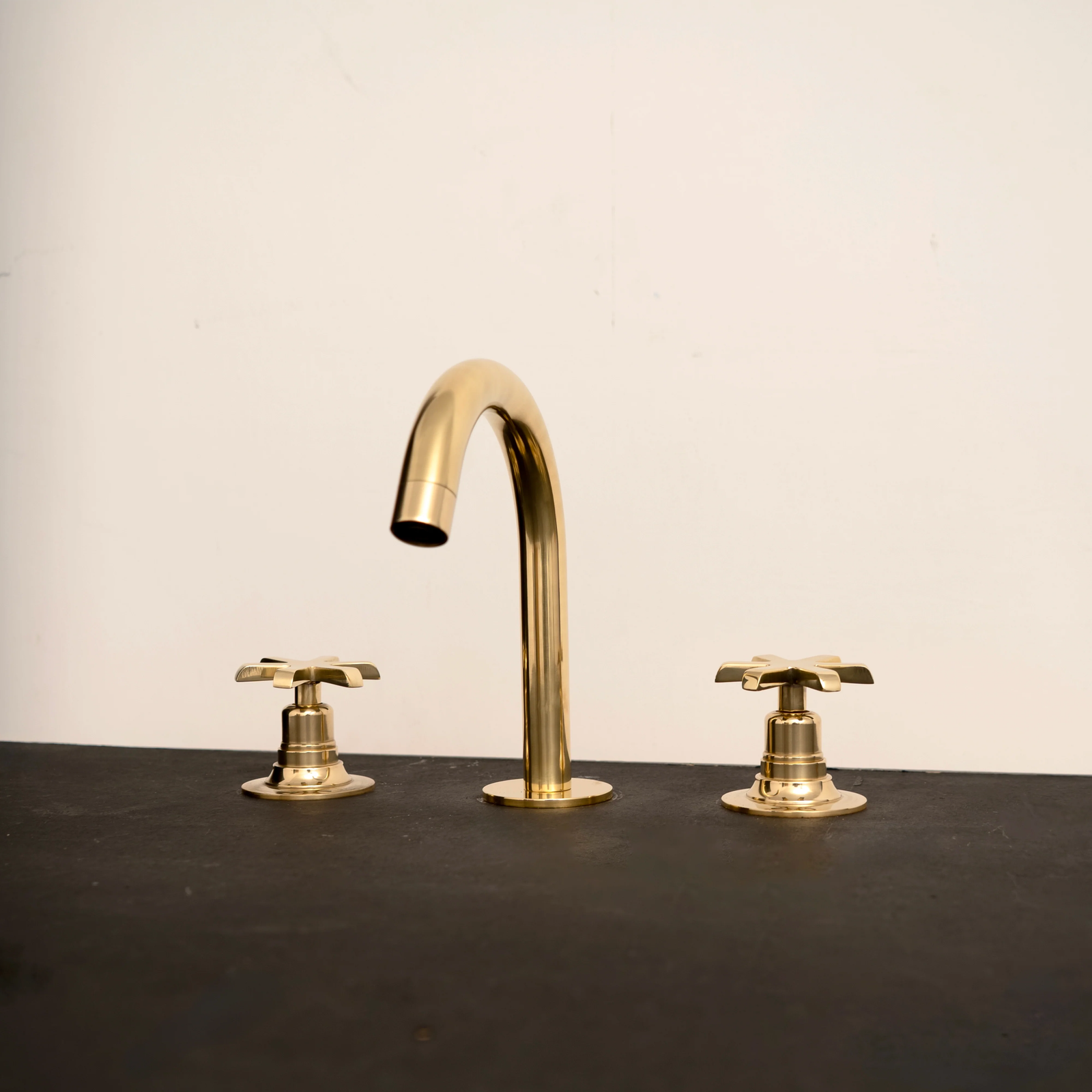 This unlacquered brass deck-mounted sink faucet with cross handles has a traditional shape that extends over your sink for a streamlined look and feel. The design of this solid brass tap is inspired by authentic traditional Moroccan bathrooms, with lever handles to control the temperature and water flow.