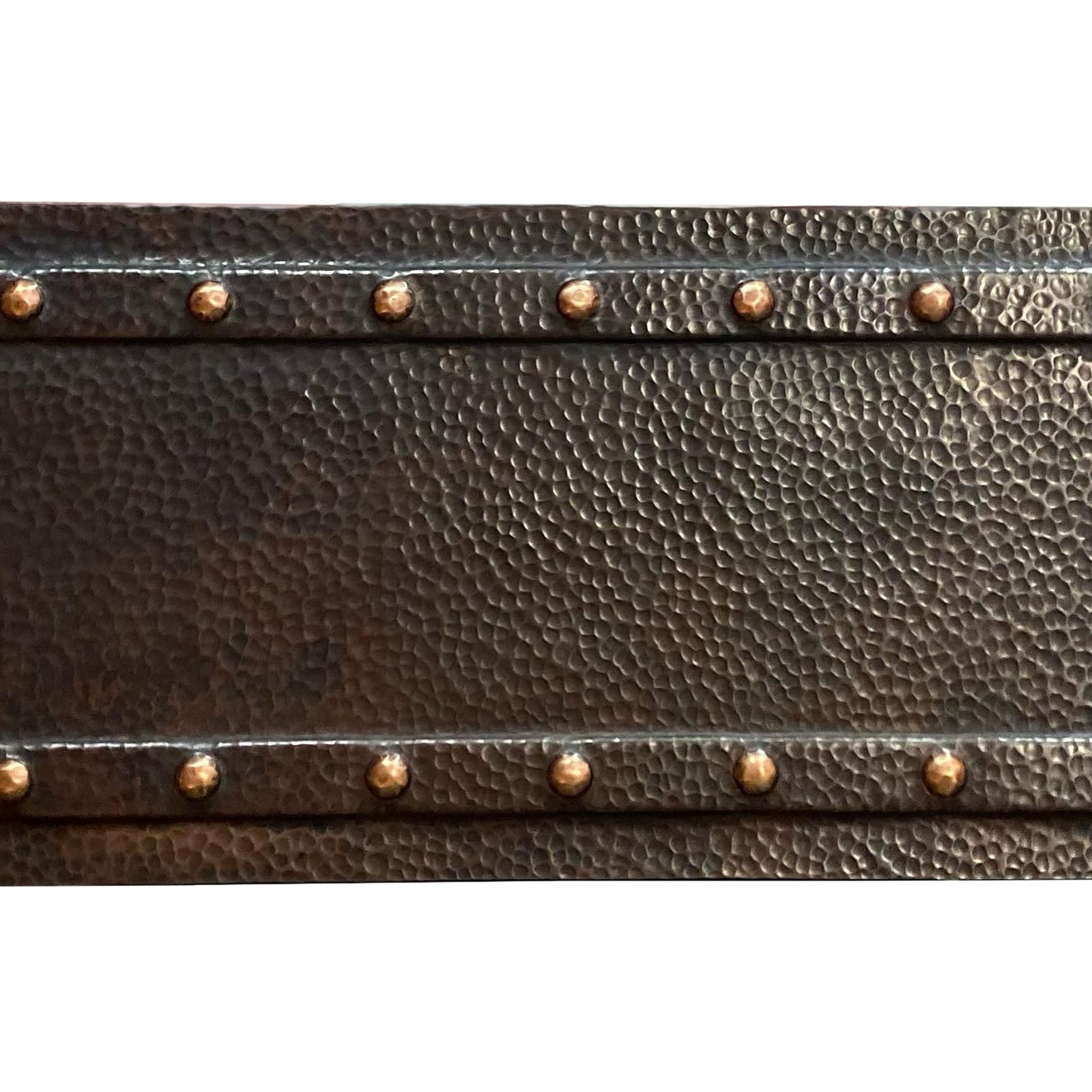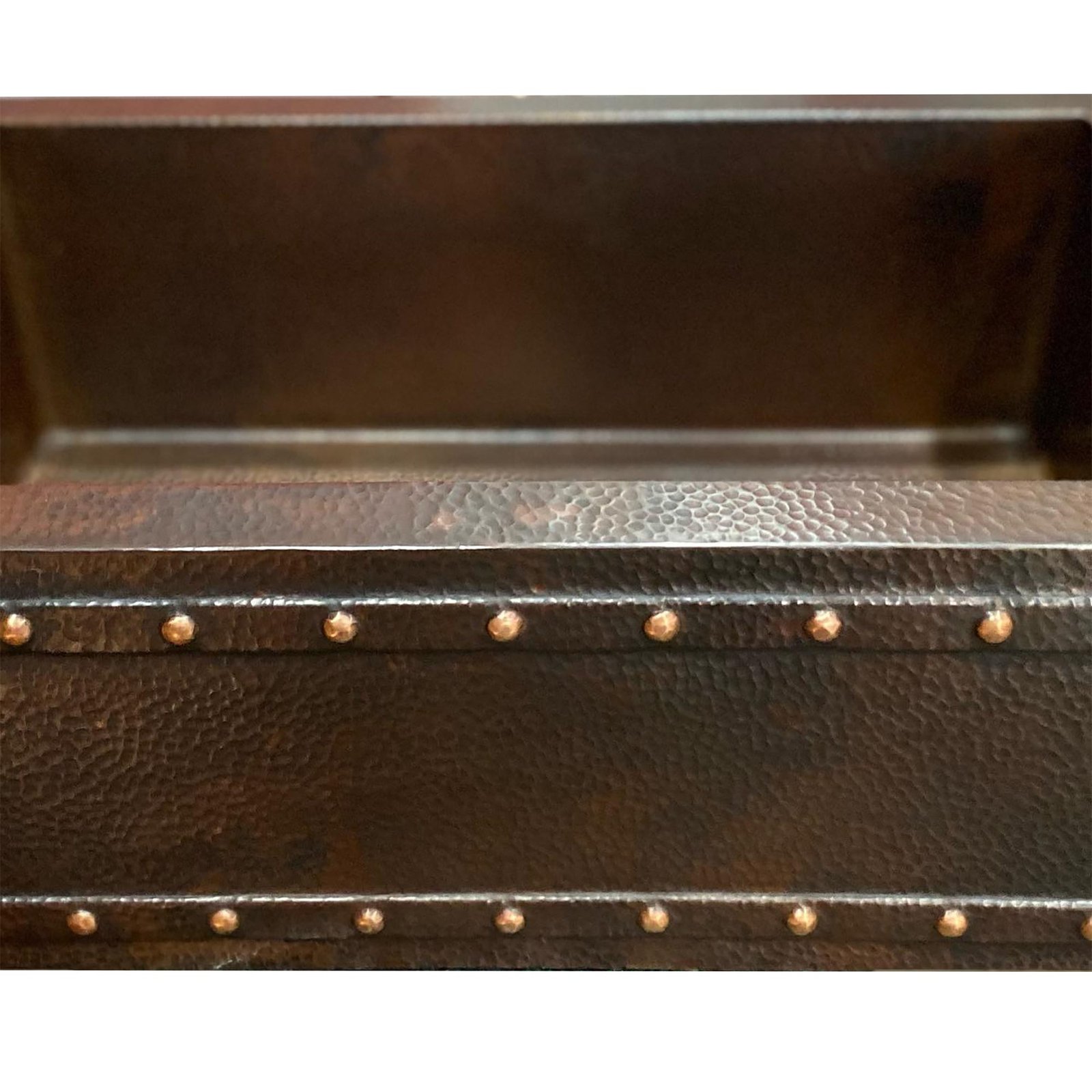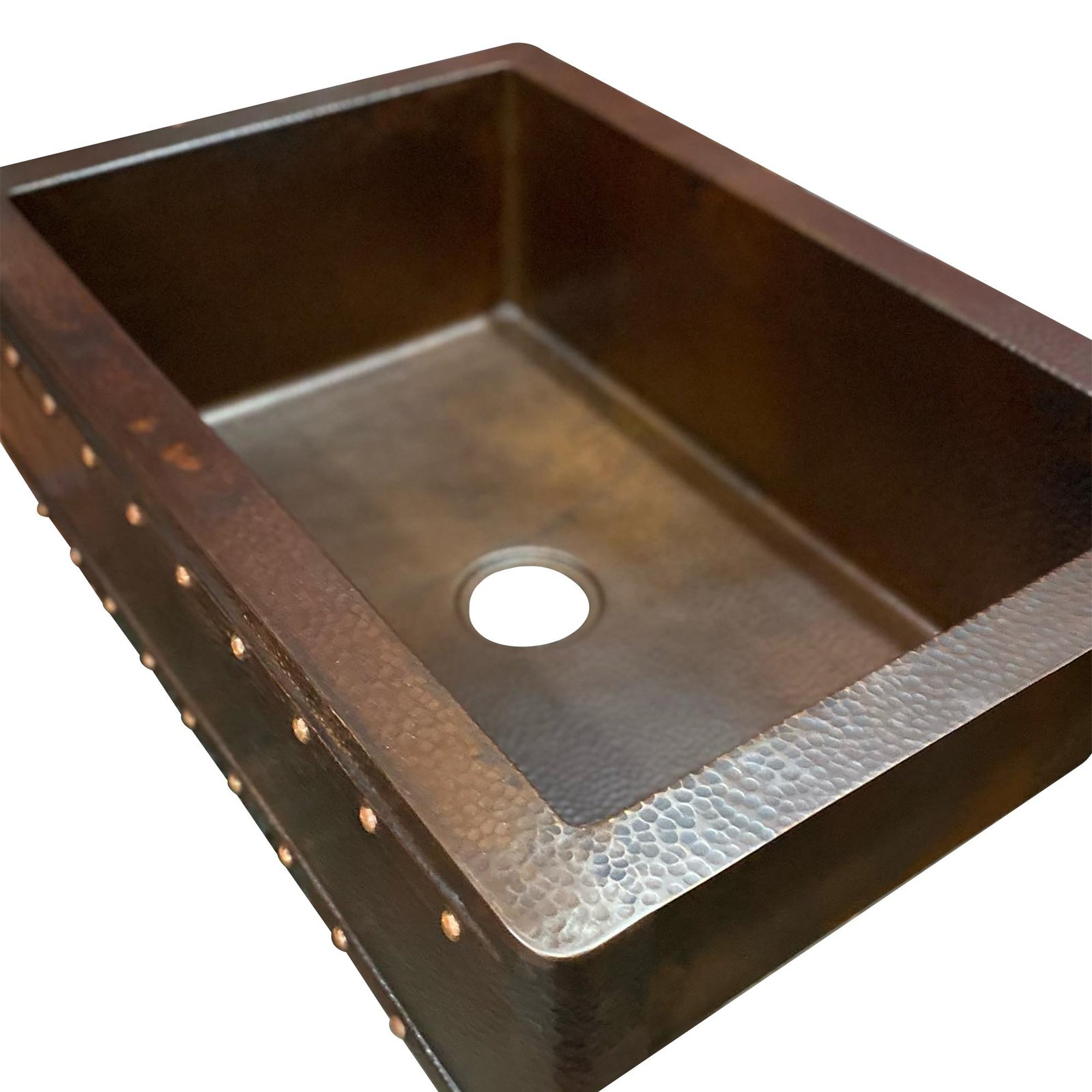 The product shown in the images is a dual mount basin farmhouse kitchen sink crafted from hammered copper, featuring a distinctive front apron sink design embellished with a row of decorative rivets along the top edge. The textured surface is indicative of hand-hammered copper, which adds a rustic yet elegant aesthetic to the sink. This design detail not only adds visual interest but also reinforces the vintage-inspired appeal of the sink, making it a striking addition to any kitchen that values both functionality and style.stylish space.