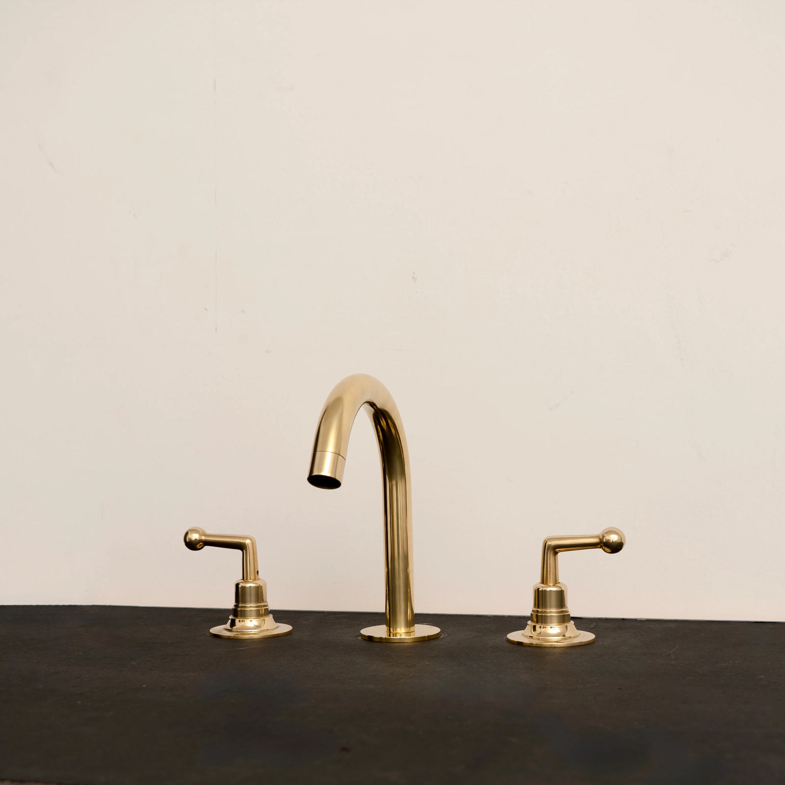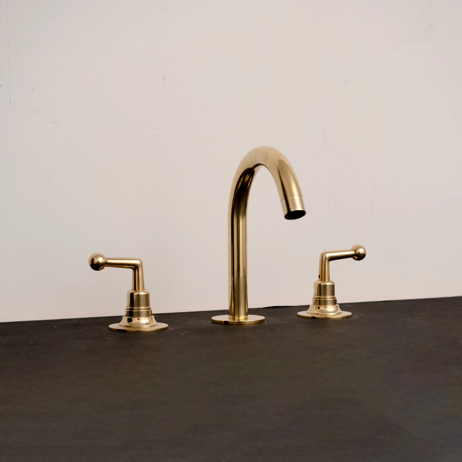 This unlacquered brass deck-mounted sink faucet with lever handles has a traditional shape that extends over your sink for a streamlined look and feels. The design of this solid brass tap is inspired by authentic traditional Moroccan bathrooms, with lever handles to control the temperature and water flow.