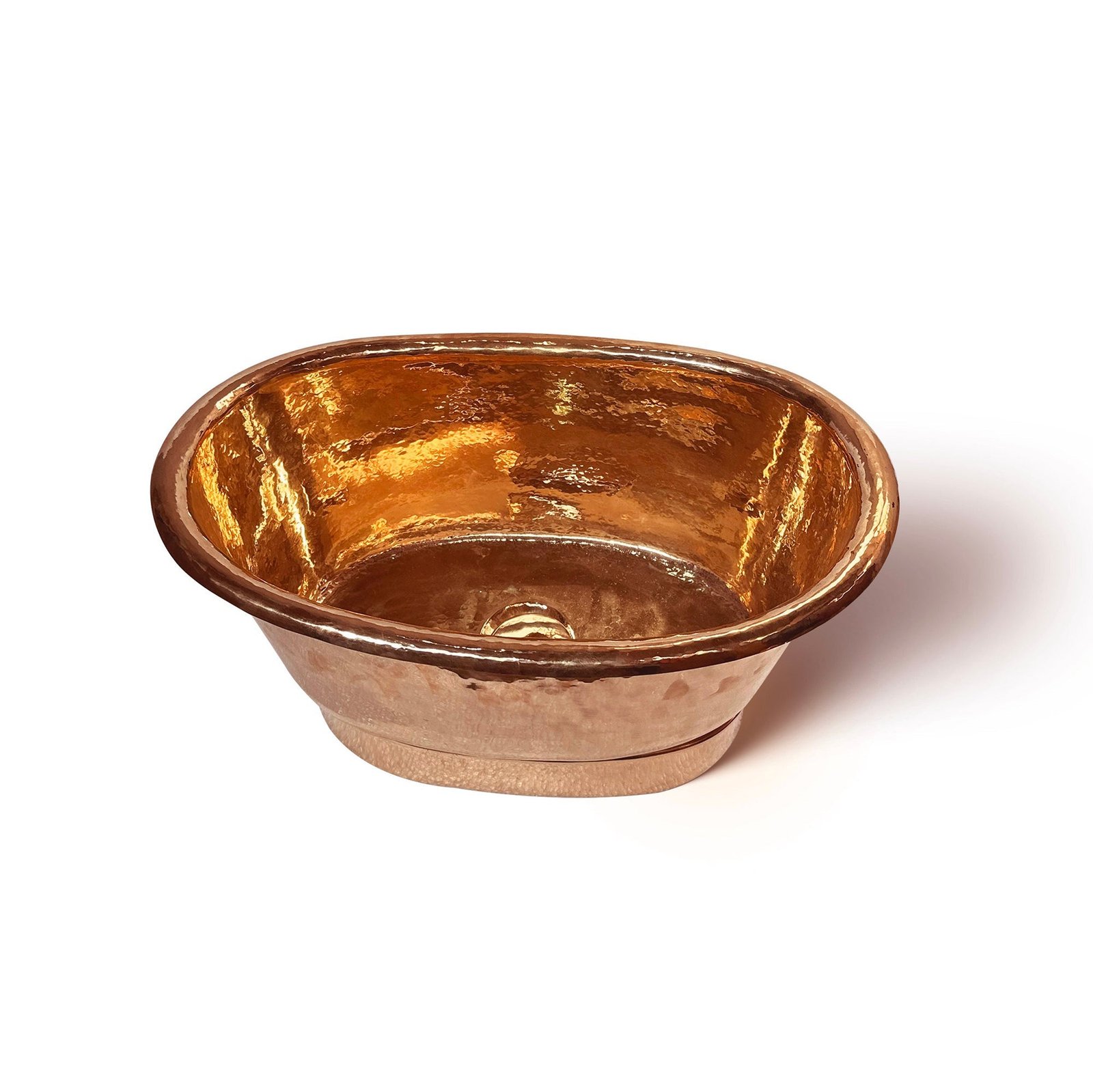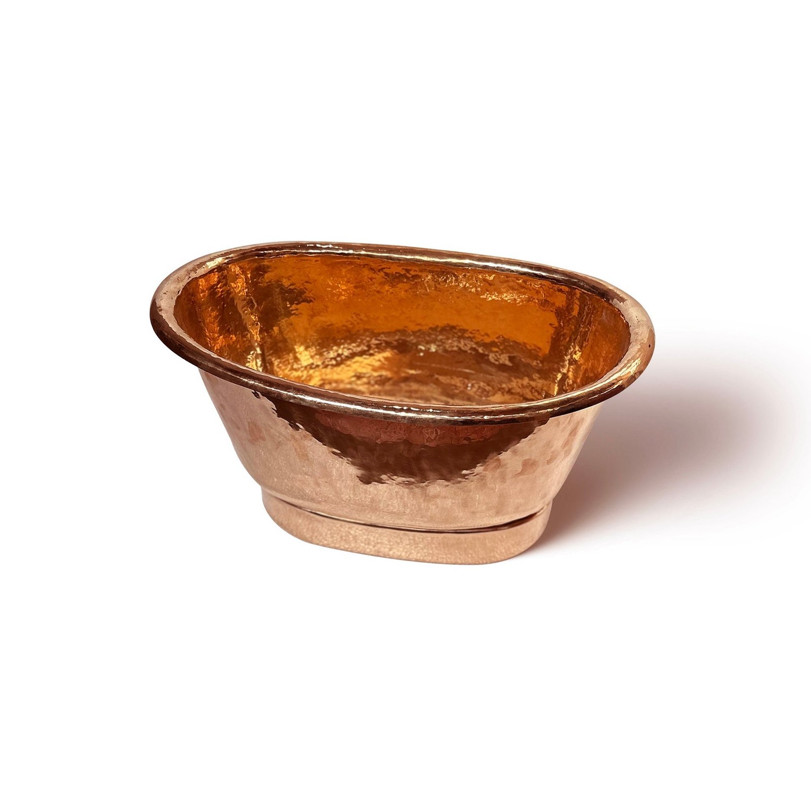 Discover the allure of our hand-hammered copper basin, a testament to timeless elegance with its richly toned interior that glows with a natural copper luster. Ideal for a luxurious bathroom centerpiece or a striking decorative accent, this basin’s exterior contrasts beautifully in texture and tone, showcasing the meticulous hand-hammered detailing that speaks to its artisanal craftsmanship. The classic, tub-like shape merges functionality with grandeur, offering both a deep, accommodating well for practical use and a style statement for your home décor. Standing firm on a solid base, this copper basin is a harmonious blend of rustic charm and sophisticated polish, designed for those who covet a fusion of durability and decorative beauty in their living spaces.