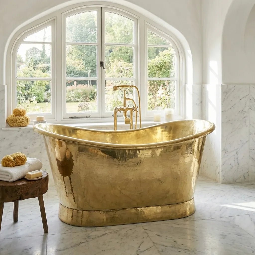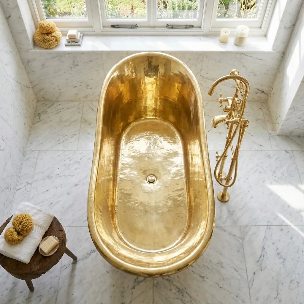 This handmade solid brass freestanding bathtub features a refined hammered finish and a timeless luxury design. Crafted from thick, solid brass, it offers excellent heat retention and deep soaking comfort. Each tub is individually handmade, creating a one-of-a-kind centerpiece for luxury bathrooms, spas, and boutique interiors.