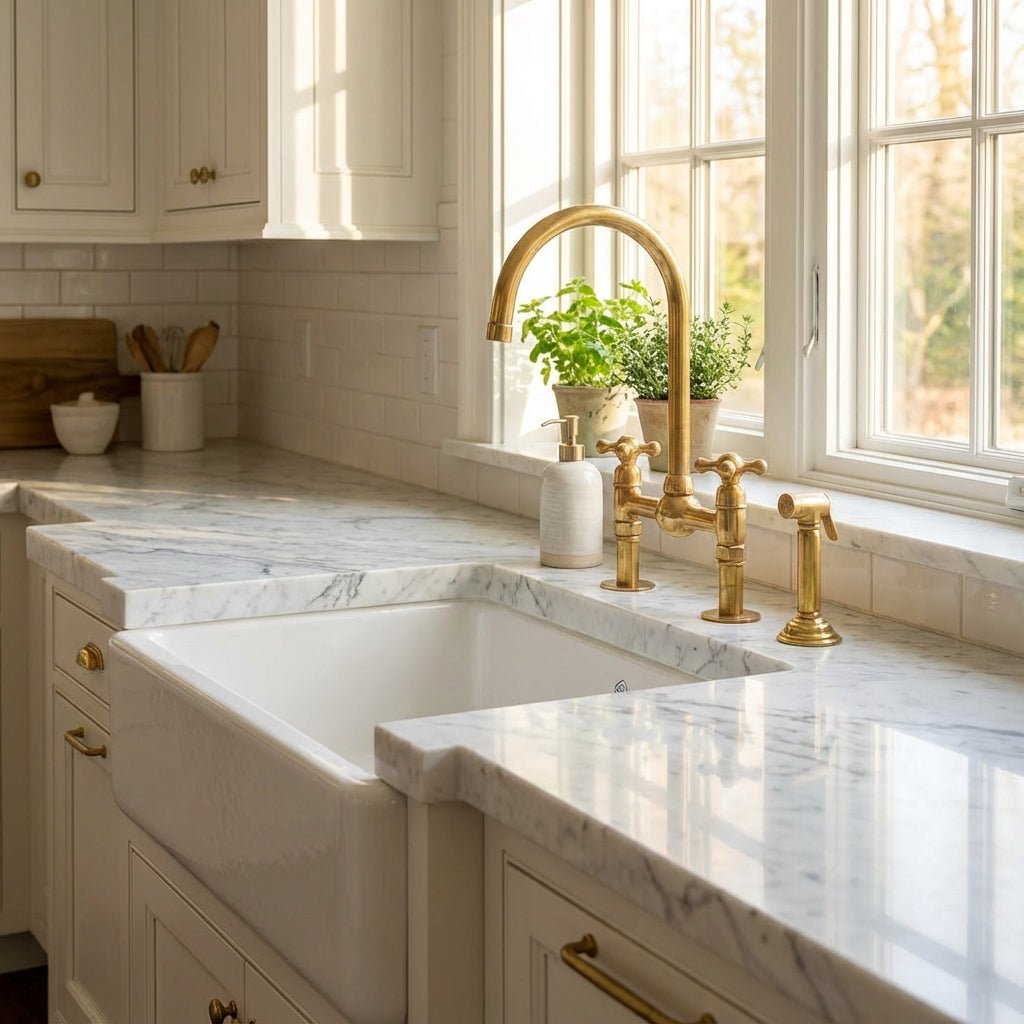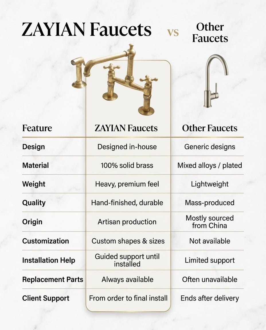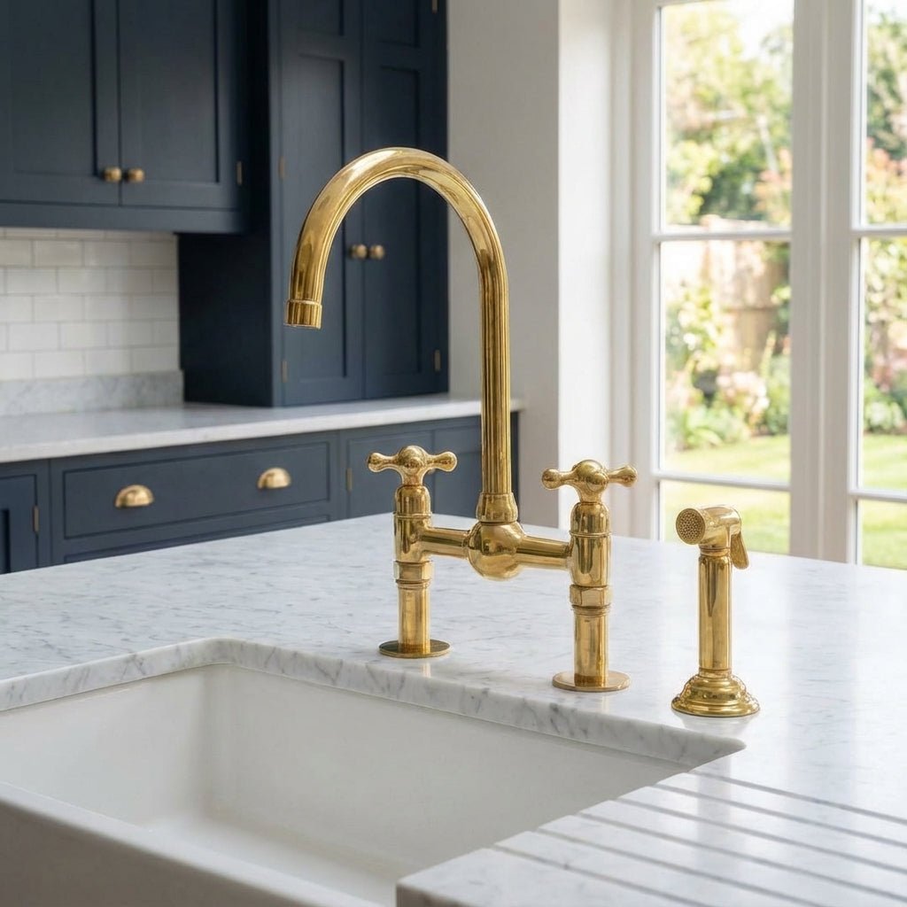 Luxury Unlacquered Brass Bridge Faucet Island Kitchen brings timeless character and solid craftsmanship to statement kitchens and central islands. Made entirely from heavy solid brass, this bridge-style faucet delivers a refined farmhouse look with a warm, living finish that naturally ages and develops a rich patina over time.