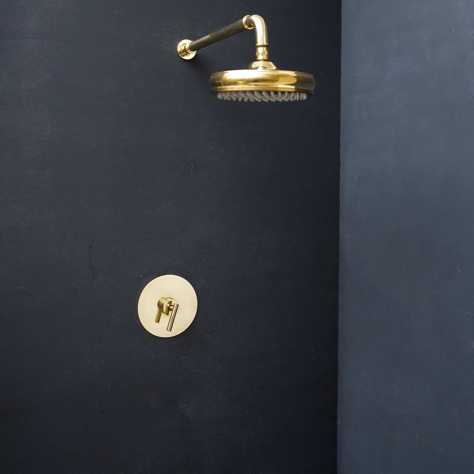 This unlacquered brass single thermostatic handle seamlessly controls on/off and hot/cold functions, ensuring precise temperature adjustments. Mounted on a sleek 17cm diameter brass back plate, this fixture combines functionality with a touch of timeless elegance, making it a sophisticated addition to your bathroom