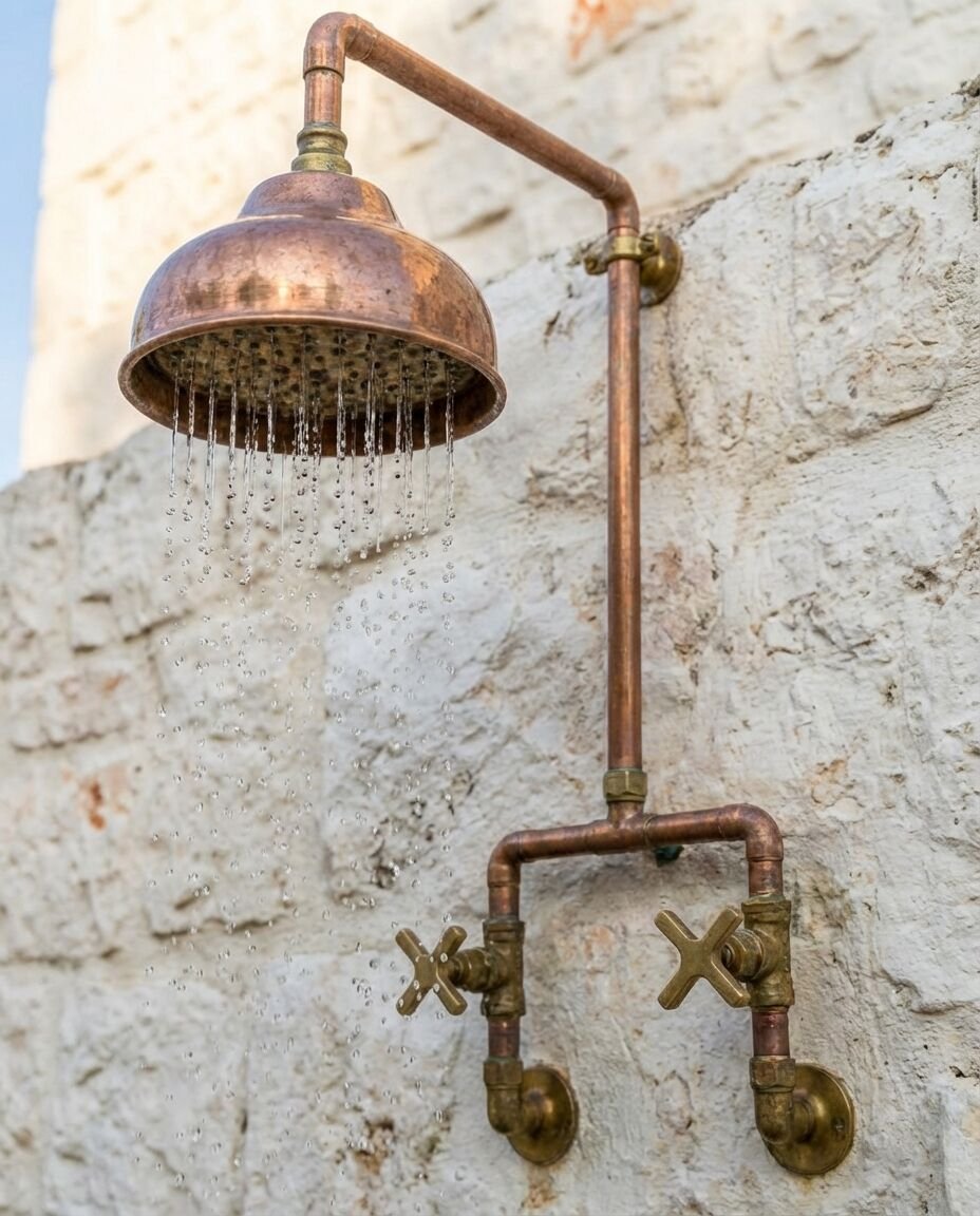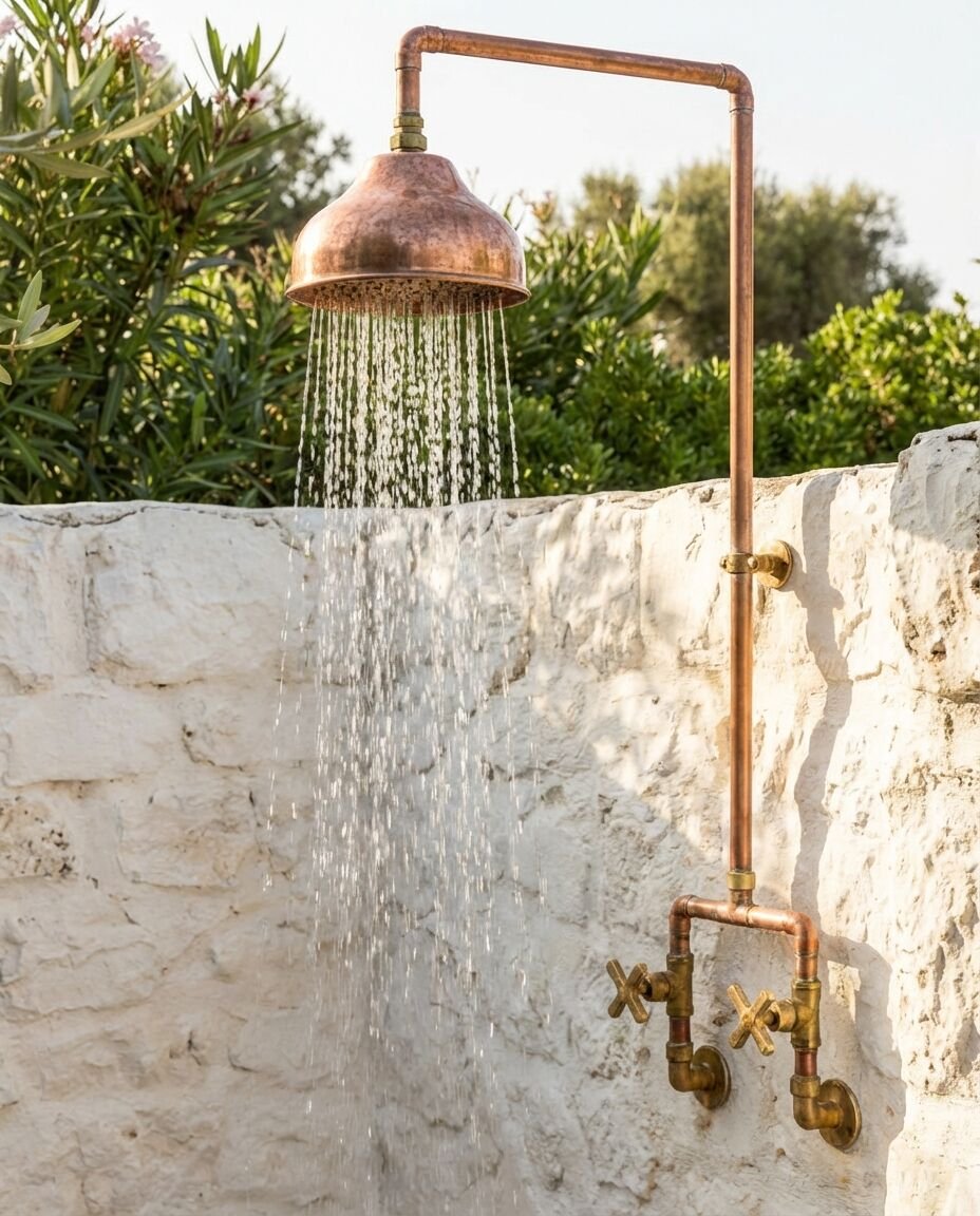 Perfect for Mediterranean villas, Moroccan riads, beach houses, or boutique hotels, this outdoor copper shower blends traditional craftsmanship with functional elegance.
