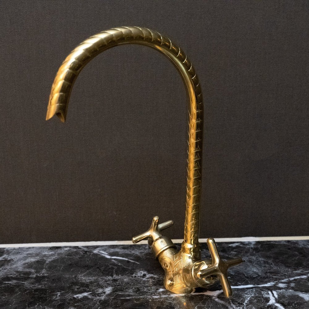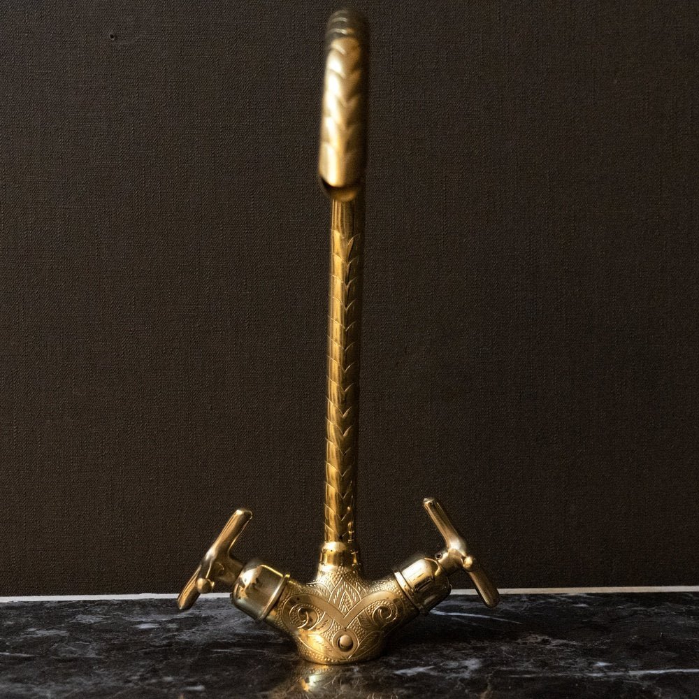 This Handcrafted Unlacquered Brass Bathroom Faucet with flat cross handles has a gooseneck shape that extends over your sink for a streamlined look and feels. The design of this solid brass product, is inspired by the shape of the medina’s door, Traditional cross handles to control the temperature and water flow.