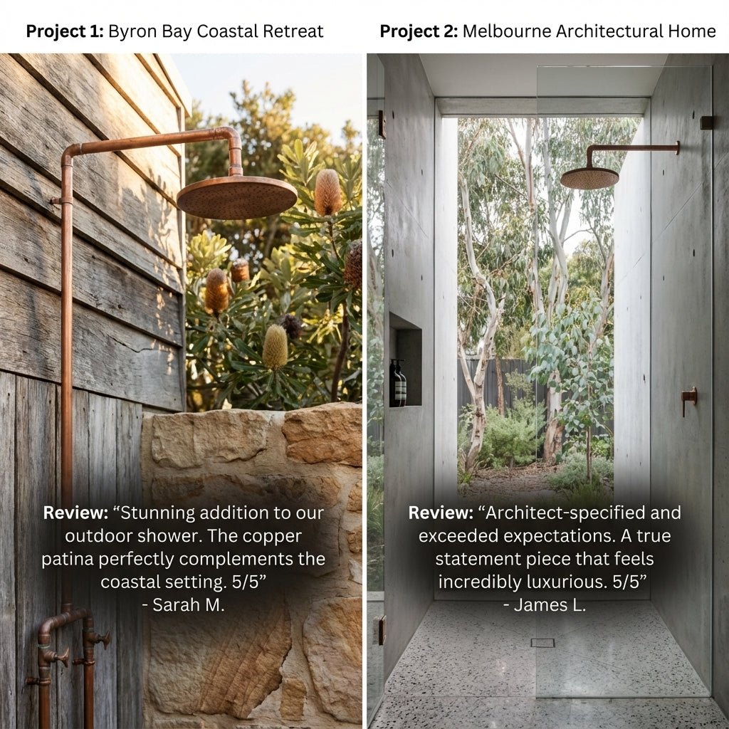 Handcrafted from solid copper, this outdoor rain shower head features a rustic design that naturally develops a beautiful patina over time. Ideal for garden, poolside, and outdoor shower installations.