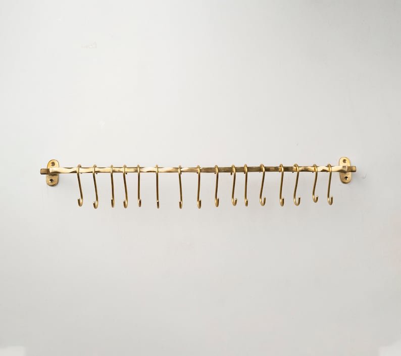 Our Unlacquered Solid Brass Pot Rail with Hooks, a charming Vintage Pot Hanger for your kitchen and beyond. This multi-functional piece seamlessly fits into any indoor space, serving as a stylish kitchen utensil holder for pots, pans, knives, and cooking gadgets. It’s equally at home in the bathroom, where it can be used to hang towels, bathrobes, and brushes. Additionally, maximize your organization by utilizing it to store keys, hats, umbrellas, and coats discreetly behind the door.