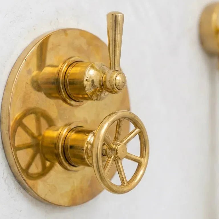The shower system features classic round wheel handles crafted from solid unlacquered brass, designed with an exposed spoke detail for a refined vintage-industrial look. The knurled edges and balanced diameter provide a comfortable, confident grip, allowing smooth and precise control of water temperature and flow.