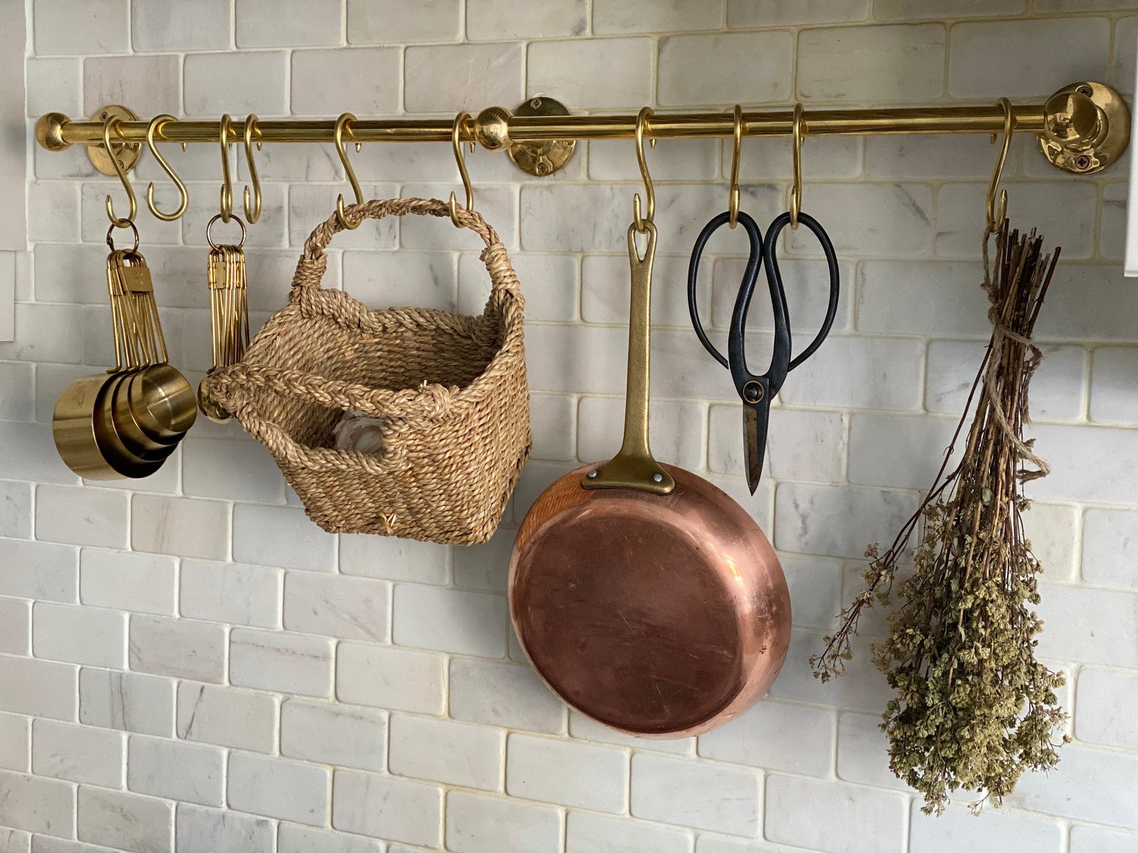 Unlacquered Brass Wall Mounted Pot Rack, Brass Kitchen Rail with Hooks