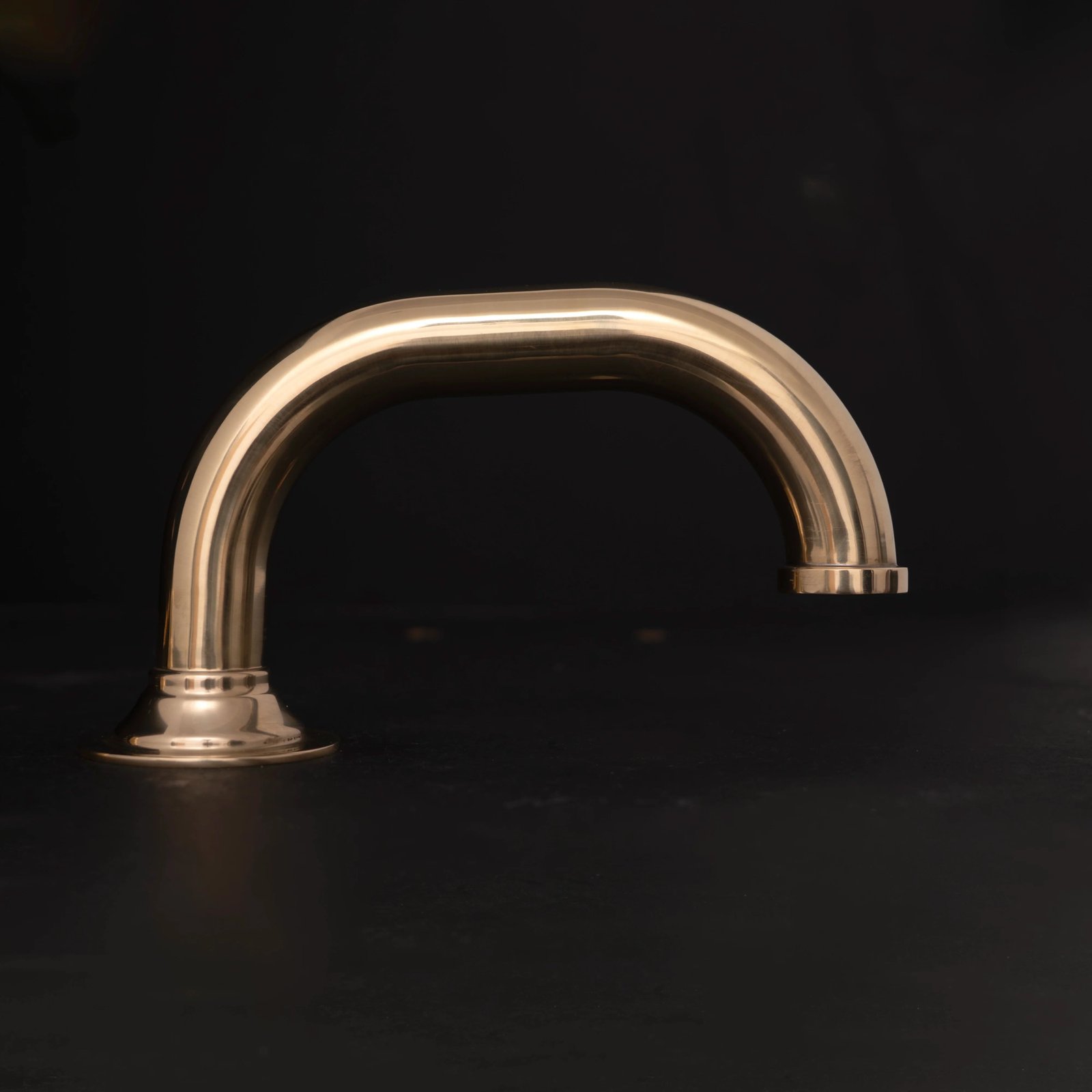 This unlacquered brass deck-mounted sink faucet with cross handles has a traditional shape that extends over your sink for a streamlined look and feels. The design of this solid brass tap is inspired by authentic traditional Moroccan bathrooms, with lever handles to control the temperature and water flow.